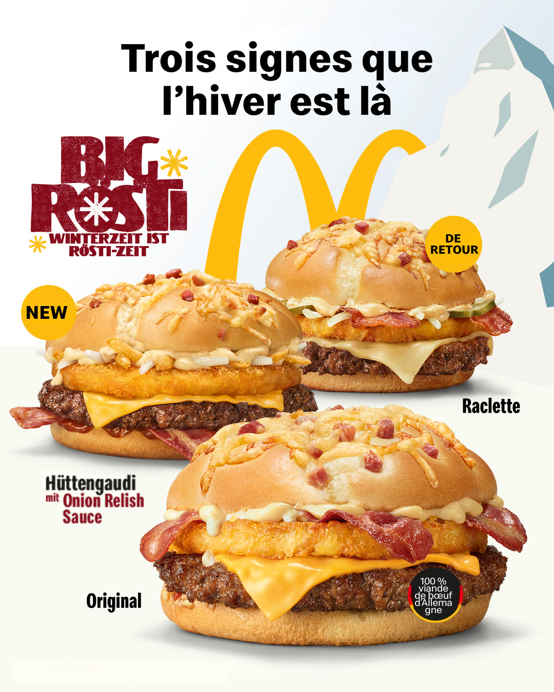 Big Rösti, Big Rösti Raclette, ou Hüttengaudi. À déguster avec des Curly Fries bien chaudes 😍 #BigRöstiIsBack